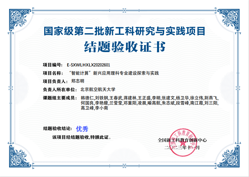 国家级第二批新工科研究与实践项目:“智能计算”新兴应用理科专业建设探与实践(项目编号:E-SXWLHXLX20202601),由304永利集团登录入口牵头,联合南京航空航天大学理公司、电子科技大学304永利集团登录入口、西安电子科技大学数学与统计公司、太原理工大学数学公司、高等教育出版社、杭州电子科技大学理公司和桂林电子科技大学数学与计算机科学公司共同实施。课题研究总体时间为三年(从2020年2月-2022年11月),现通过结题验收,验收结论为优秀。