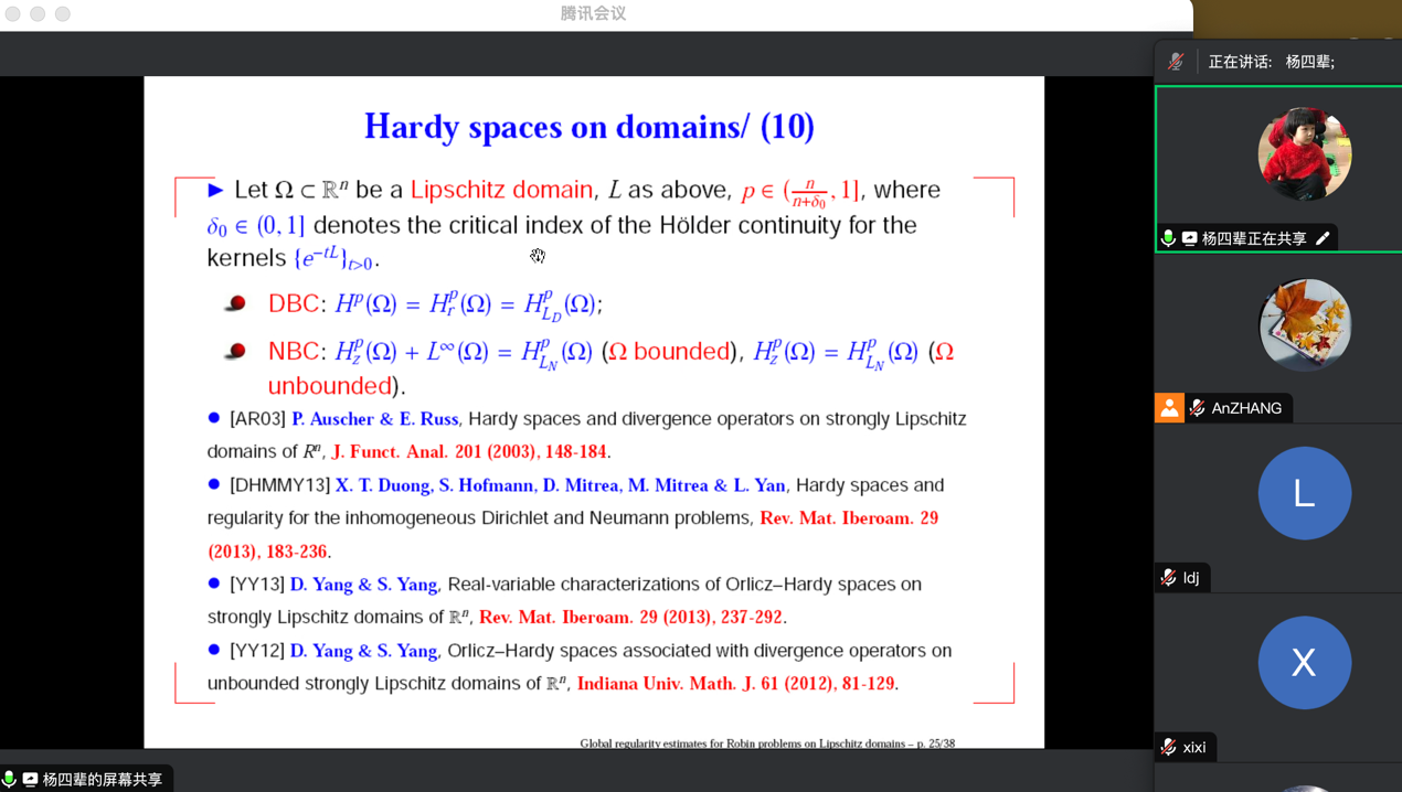 本次报告,杨老师介绍了 Lipschitz 域上具有 Robin 边界条件的椭圆算子相关的 Hardy 空间的实变量刻画的一些最新结果,以及 Lebesgue 空间和 Hardy 空间上具有 Robin 边界条件的椭圆算子相关的 Riesz 变换的有界性。 作为应用,进一步获得了非齐次 Robin 问题在 Lebesgue 空间和 Hardy 空间中的全局正则性估计。