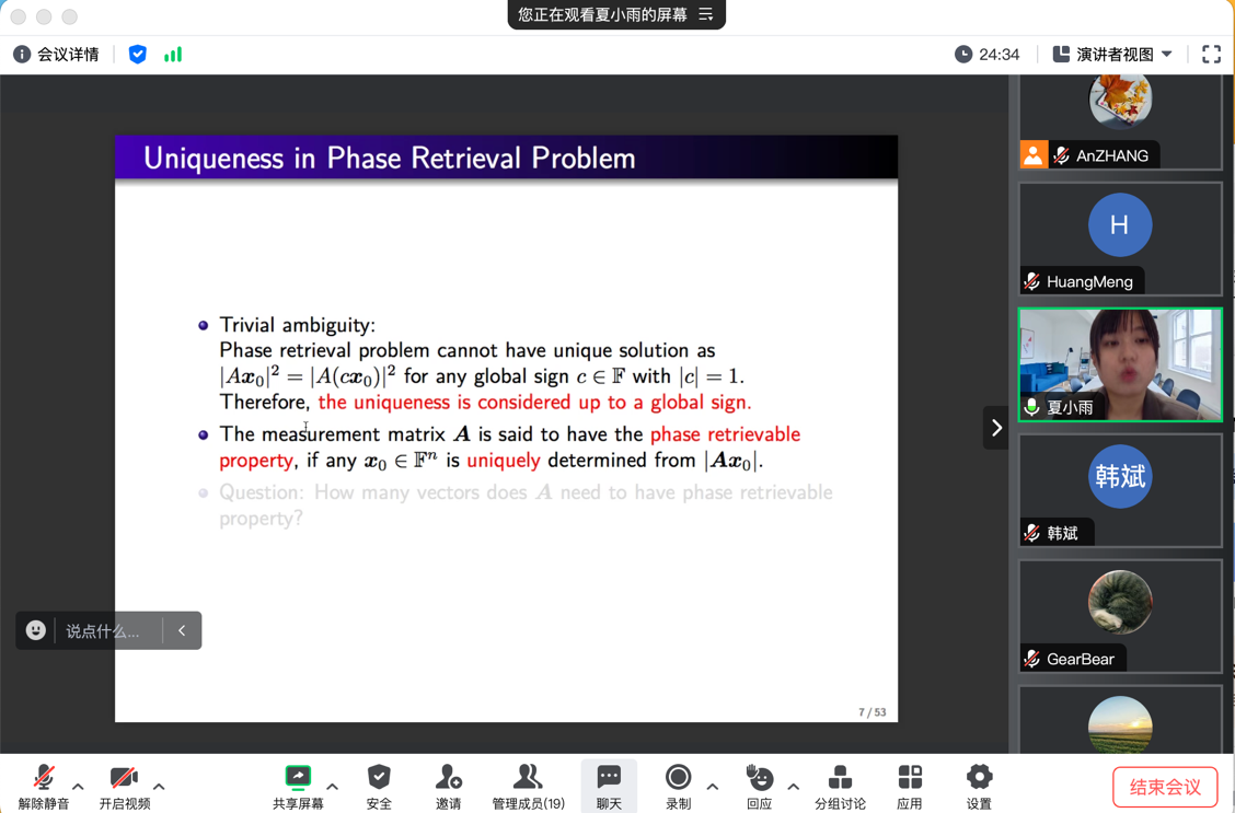 本次报告,夏老师介绍了相位恢复和盲反卷积的相关理论。不同于传统的高斯随机测量,此次报告内容专注于掩蔽傅立叶测量下的相位恢复问题,讨论了一些截断Wirtinger流算法并提高了采样复杂度,这部分回答了E. Candès提出的问题。 此外还分析了调制输入的盲反卷积问题,这是一个具有挑战性的问题,因为模糊内核和输入信号都是未知的。当信号稀疏且模糊核缺乏支持时,提出了一种采样复杂度小于核范数最小化和最小二乘法的算法。报告人详细介绍了相关参考文献使用的各种不同的分析工具和研究思路,最后介绍了作者最新的研究成果。