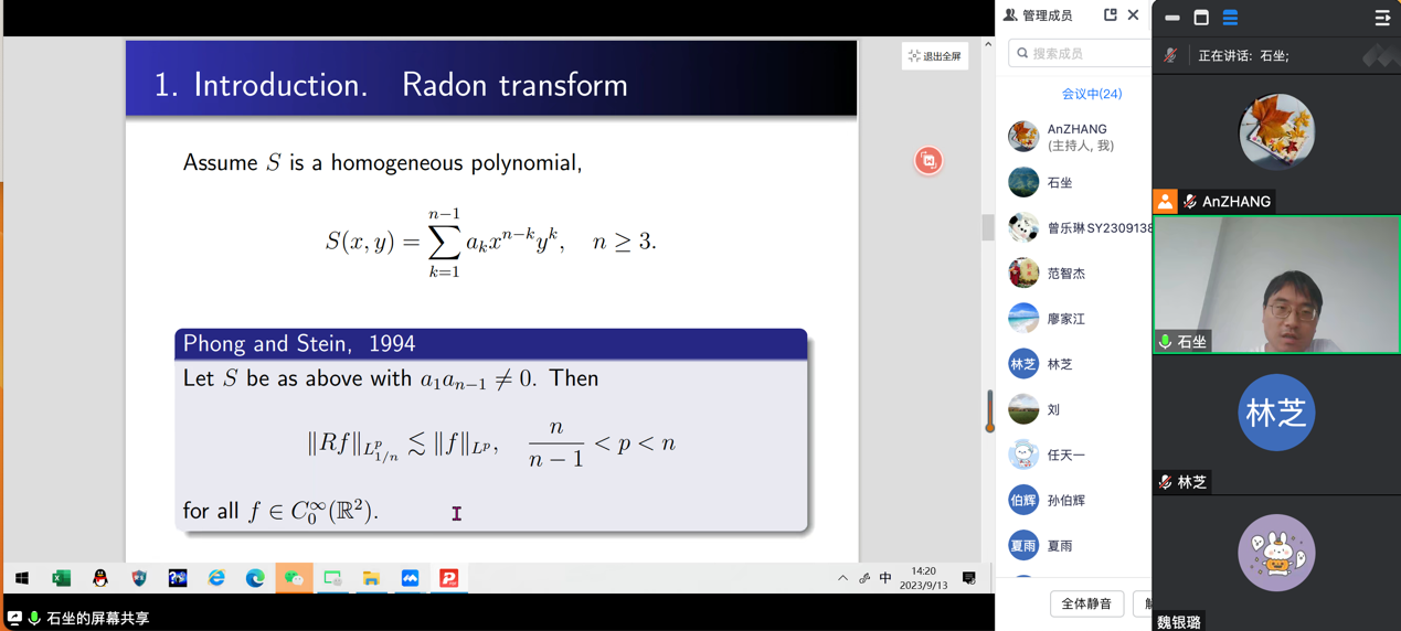 2023年09月13日,中南大学石坐顺华和广州大学范智杰教授,应邀为304永利集团登录入口师生做了题为 “Failure of endpoint regularity of Radon transforms”和“Recent progress on Schatten classes and Riesz transform commutators”的学术报告。报告由张安老师主持。