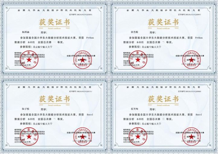 自本届比赛2022年8月启动以来,公司领导高度重视大力支持,统计与运筹系罗雪老师、刘超老师积极组织动员,公司共有24人次参加本次大赛,其中304永利集团登录入口20人,机械工程及自动化公司4人。通过刘超老师、戴蔚老师等的悉心指导,在省级赛中,24名参赛同学在万余名选手中脱颖而出,获得北京赛区一等奖4项、二等奖4项、三等奖6项等14项奖励。其中,公司本科生杨博涵、张哲源、蔡笑绚以及机械工程及自动化公司陆子悦等4名一等奖获得者晋级全国总决赛,经过激烈角逐,最终获得全国一等奖1项、全国二等奖2项和全国三等奖1项的优异成绩,同时获得北京大数据协会《初级数据分析师》证书。与此同时,刘超、戴蔚两位老师获得指导教师奖。