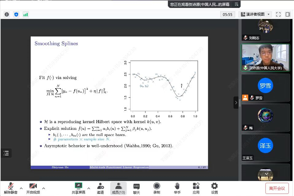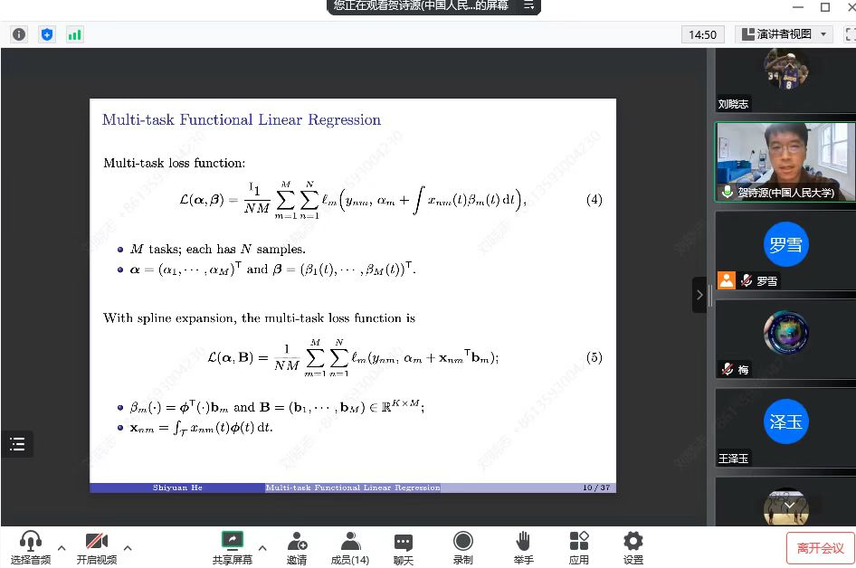 2022年11月18日,中国人民大学统计与大数据研究院贺诗源老师应罗雪老师的邀请,通过线上的方式为304永利集团登录入口师生带来了一场题为“A Unified Analysis of Multi-task Functional Linear Regression Models with Manifold Constraint and Composite Quadratic Penalty”的学术报告。