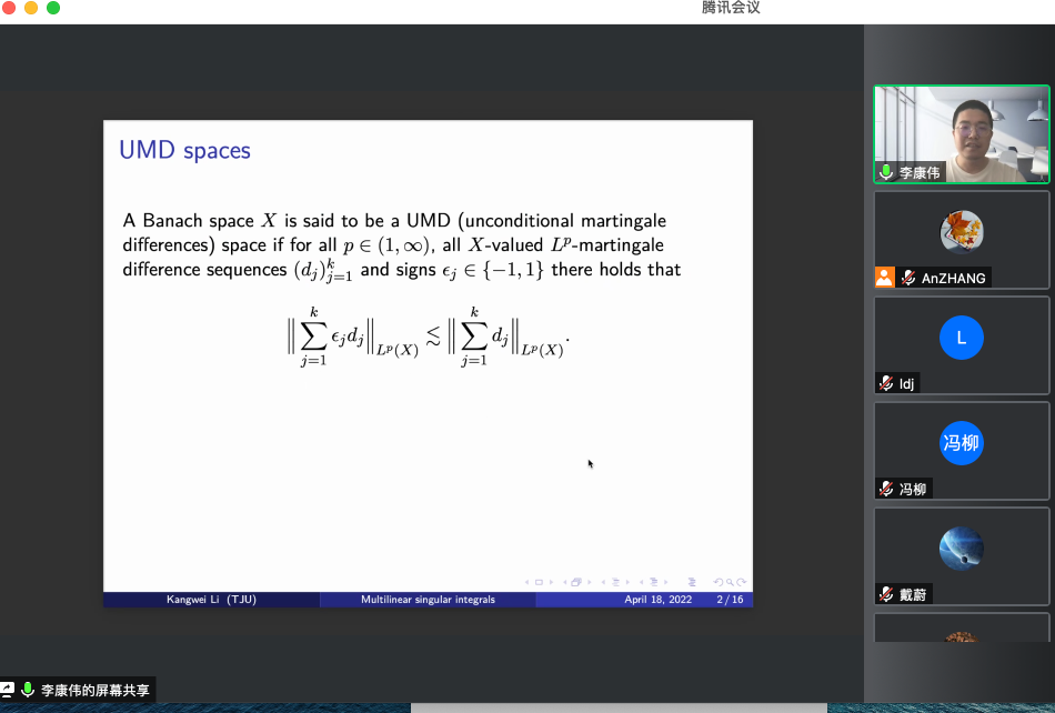 2022年04月18日,天津大学李康伟教授,应邀为304永利集团登录入口师生做了题为 “UMD-valued extension of multilinear singular integrals”的学术报告,报告由张安老师主持。