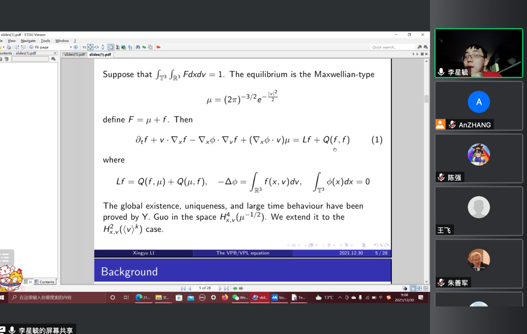 2021年12月30日下午,巴黎第九大学李星毓博士,应邀为304永利集团登录入口师生做了题为 “The Vlasov-Poisson-Boltzmann/Landau equation with polynomial perturbation near Maxwellian”的学术报告,报告由任天一和张安老师主持。