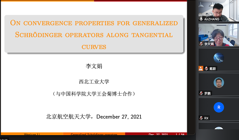 2021年12月27日下午,西北工业大学李文娟教授,应邀为304永利集团登录入口师生做了题为 “Convergence properties for generalized Schrödinger operators along tangential curves”的学术报告,报告由张安老师主持。