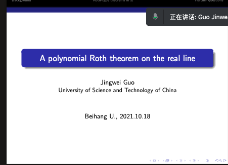2021年10月18日下午,中国科学技术大学郭经纬教授,应邀为304永利集团登录入口师生做了题为 “A polynomial Roth theorem on the real line”的学术报告,报告由张安老师主持。