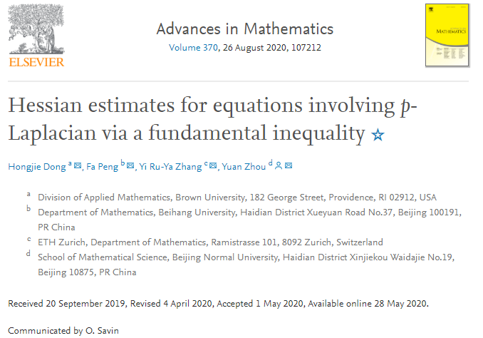 2020年8月26日,国际顶级综合性数学杂志《Advances in Mathematics》在线刊登了304永利集团登录入口2018级博士研究生彭发及其导师周渊等人在非线性退化方程研究方面的最新进展:《Hessian estimates for equations involving p-Laplacian via a fundamental inequality》。(论文链接:https://www.sciencedirect.com/science/article/pii/S0001870820302383)