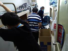 志愿服务队分成9组开展工作,各组老师与员工们直播打包全过程,包括物品的收纳情况,易碎易坏物品的放置情况,同时反复确认重要文件和证书的和归置情况。直播气氛轻松愉快,尽管隔屏相望,“这个很珍贵,给你包好放在箱子里”“谢谢老师”“这个确定不要吗?这还有空给你装上吧”“老师辛苦了”,始终回响在各个宿舍中。