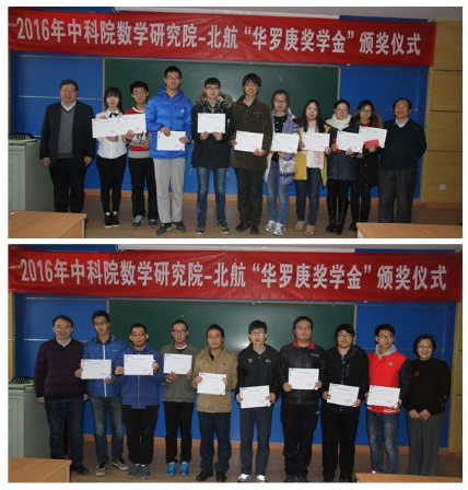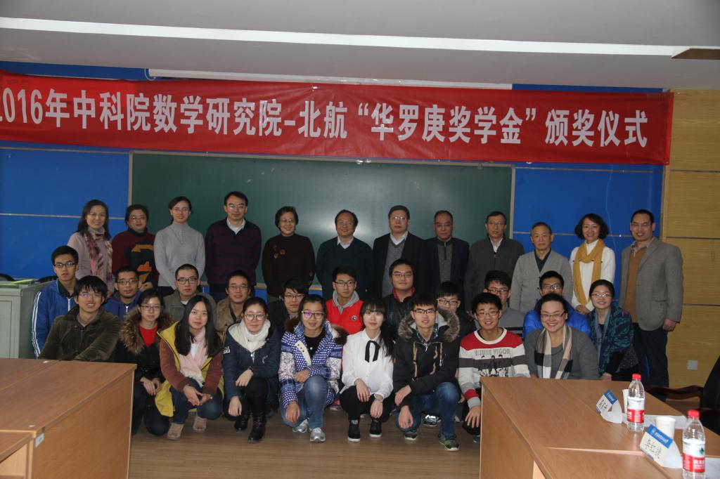 颁奖仪式上,北航数学公司经理郑志勇教授首先致辞,他先是对所有与会嘉宾的到来表示热烈的欢迎,对华密女士和中科院数公司对北航华罗庚班的关心和重视表示衷心的感谢。他指出,北航作为一所工科强校,要大力加强对基础学科的人才培养,华罗庚班的目标正是要培养具有坚实数理基础的高素质创新人才和具有解决重大应用数学问题潜质的复合型创新人才,希望今后可以继续与中科院加强合作。最后,他借用华罗庚先生“勤能补拙是良训,一分辛苦一分才”的诗句表达了对华罗庚班同学们的期待,希望同学们刻苦钻研,成为像华罗庚先生一样的人才。北航教务处处长王祖林教授在致辞中首先对北航华罗庚班多届员工被录取到巴黎高师等众多国内外名校的傲人成绩表示了高度的赞扬,接着他向获得2016年华罗庚奖的同学们表示祝贺与鼓励,他强调,希望获奖的同学们在今后学习的过程中戒骄戒躁、不辍努力,把华罗庚先生脚踏实地、勤奋向学的学习品质一直传承下去。中国科公司数公司副经理巩馥洲研究员对北航华罗庚班成立七年来取得的成果表示了充分的肯定,他指出北航华罗庚班是众多华罗庚班中最优秀的班集体之一,中科院数公司的多名院士与教授参与到华罗庚班本科生核心专业课程的授课以及科研项目指导中,效果十分显著,中科院今后会继续加强与北航华罗庚班的合作与联系,进一步提高北航数学学科的实力,同时欢迎华罗庚班同学们今后到中科院数公司深造。最后,他向华罗庚班同学们提出了几点要求和期望,希望同学们能全面发展,不仅在数学方面建树非凡,在文学造诣、工程技术等更多更广的领域内都能够有所突破。中科院数公司经理助理戴彧虹研究员宣读了“2016年华罗庚奖学金”获奖名单,华密女士与中科院数公司、北航的各位老师一同为获奖员工颁发证书。