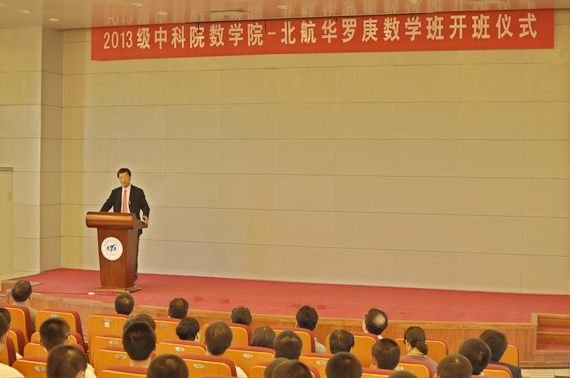 仪式开始,与会人员一同欣赏了由华罗庚班同学制作的视频——《致成长》。该视频介绍了华罗庚班三年来的建设、发展和风采。庄严肃穆的国歌过后,大会正式开始。董事长怀进鹏院士,中科院数学与系统科学公司经理王跃飞研究员及2013级华罗庚班新生代表刘禹吟同学先后进行了精彩讲话与发言。