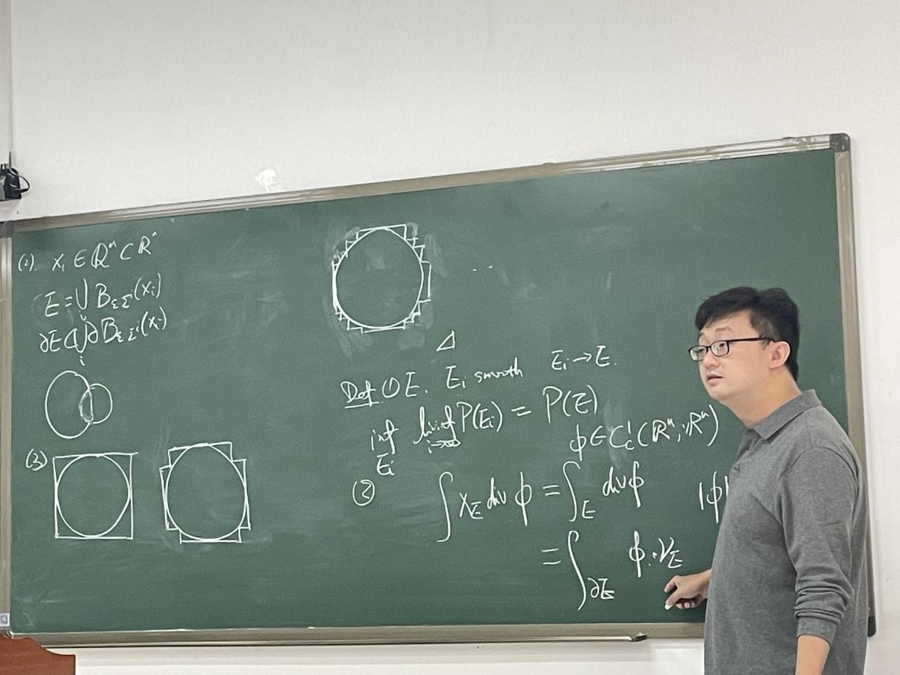 “作为数学家,我们通常喜欢用已知的东西去逼近要研究的东西。”张翼从极小曲面中的普拉托问题入手,介绍了等周不等式的基本定义,并给出3种逼近周长的等价方法,证明了等周不等式。接着,他引入 Brum-Minkowski不等式,介绍了自己最近的研究内容。
