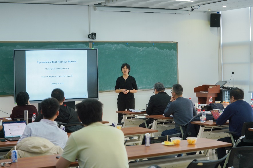 304永利集团登录入口崔春风教授作《对偶四元数矩阵特征值及其应用》报告。她回顾了对偶四元数矩阵特征值的理论和算法进展,并介绍了其在同时定位与地图构建和编队控制中的应用。