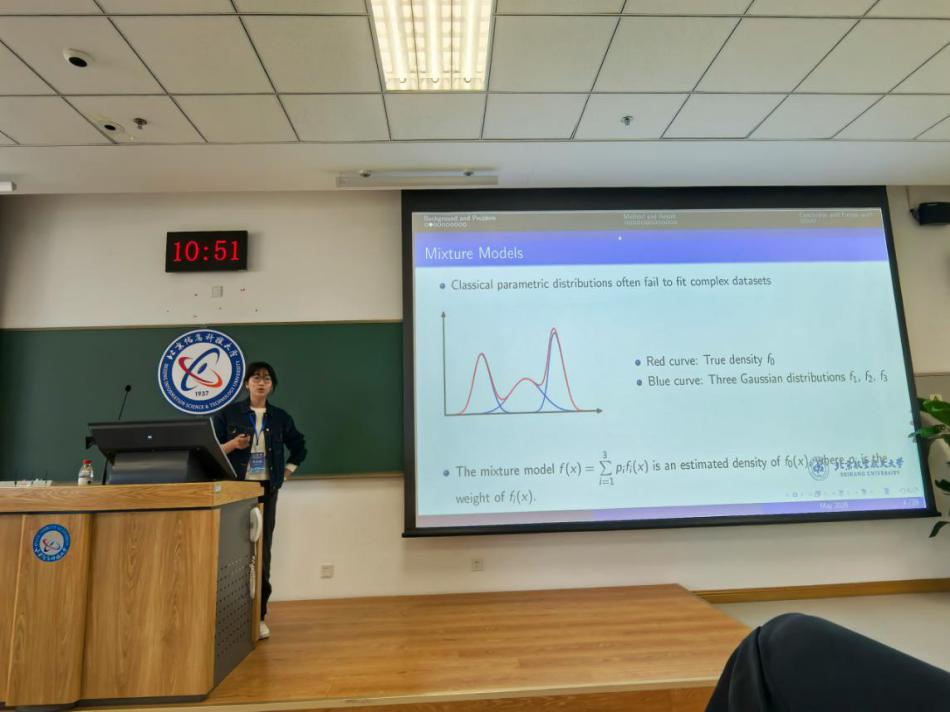 2023级博士研究生罗祎祺介绍了非参数贝叶斯密度估计中的混合模型收敛率问题,旨在构造一种能够达到极小极大最优收敛速率的高灵活性先验。通过将未知密度函数表示为正交多项式的加权和,并为权重系数构建了服从指数族分布的“筛先验”,同时施加了连续性和有界性等约束,进而证明了在此先验下贝叶斯后验可以达到极小极大最优收敛速率。