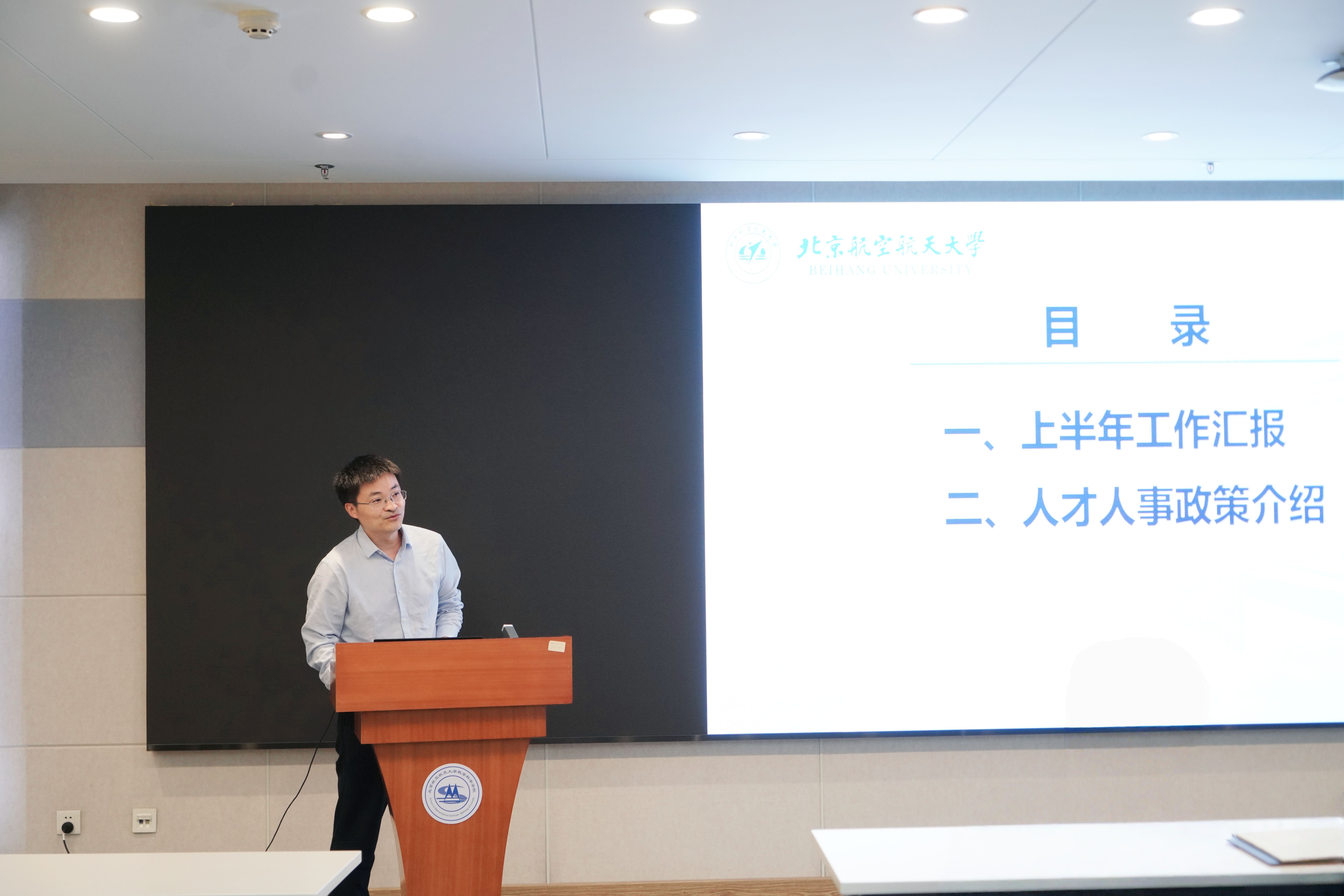经理助理王振汇报2025年上半年人才人事工作进展,指出公司顺利完成多项人才计划推荐与聘期考核,并详细解读了职称评审、人才引进政策及博士后体系,并鼓励教师积极推荐优秀人才,共同推进公司团队队伍建设。